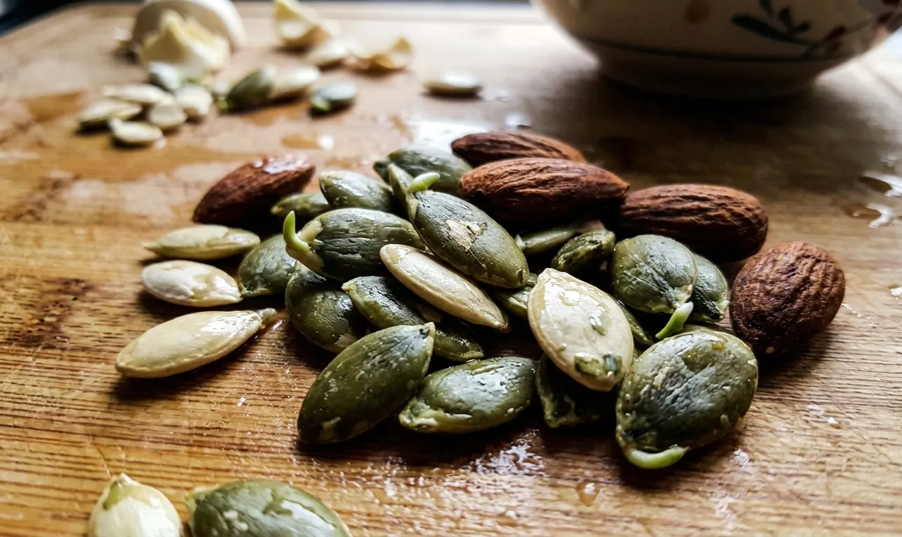 Neem een klein handje rauwe pompoenpitten of rauwe amandelen